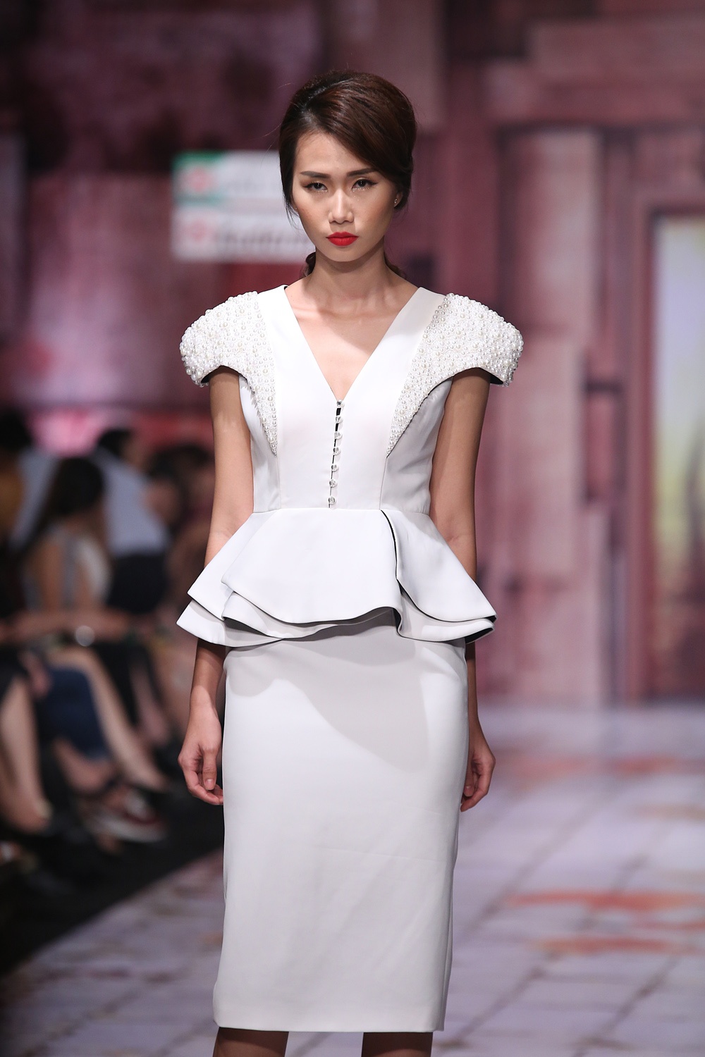| Bộ sưu tập thu đông 2015 của nhà thiết kế Xuân Lộc hướng đến vẻ thanh lịch, nền nã. Gam màu chủ đạo là tông trắng đen, tương phản trầm. Trong ảnh, Thanh Thủy trình diễn thiết kế phong cách công sở lịch thiệp. |