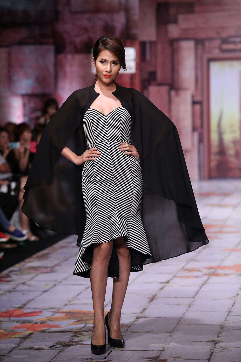 | Khánh Phương kiêu sa trên đường băng với bộ đầm cocktail ôm sát vóc dáng, áo khoác cape chất liệu voan mỏng tinh tế. |