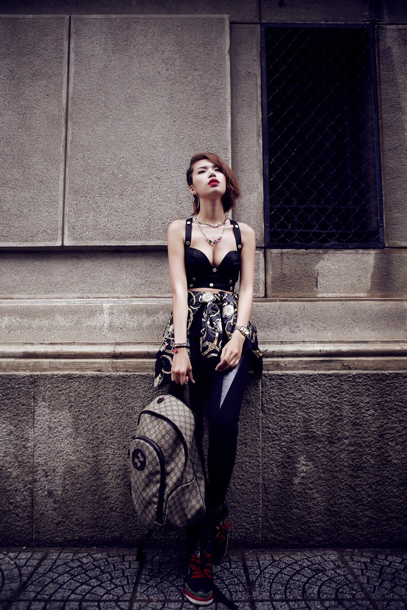 | Tự tin thể hiện phong cách tomboy cá tính. Quần da phi bóng của Zara và áo croptop của Versace. |