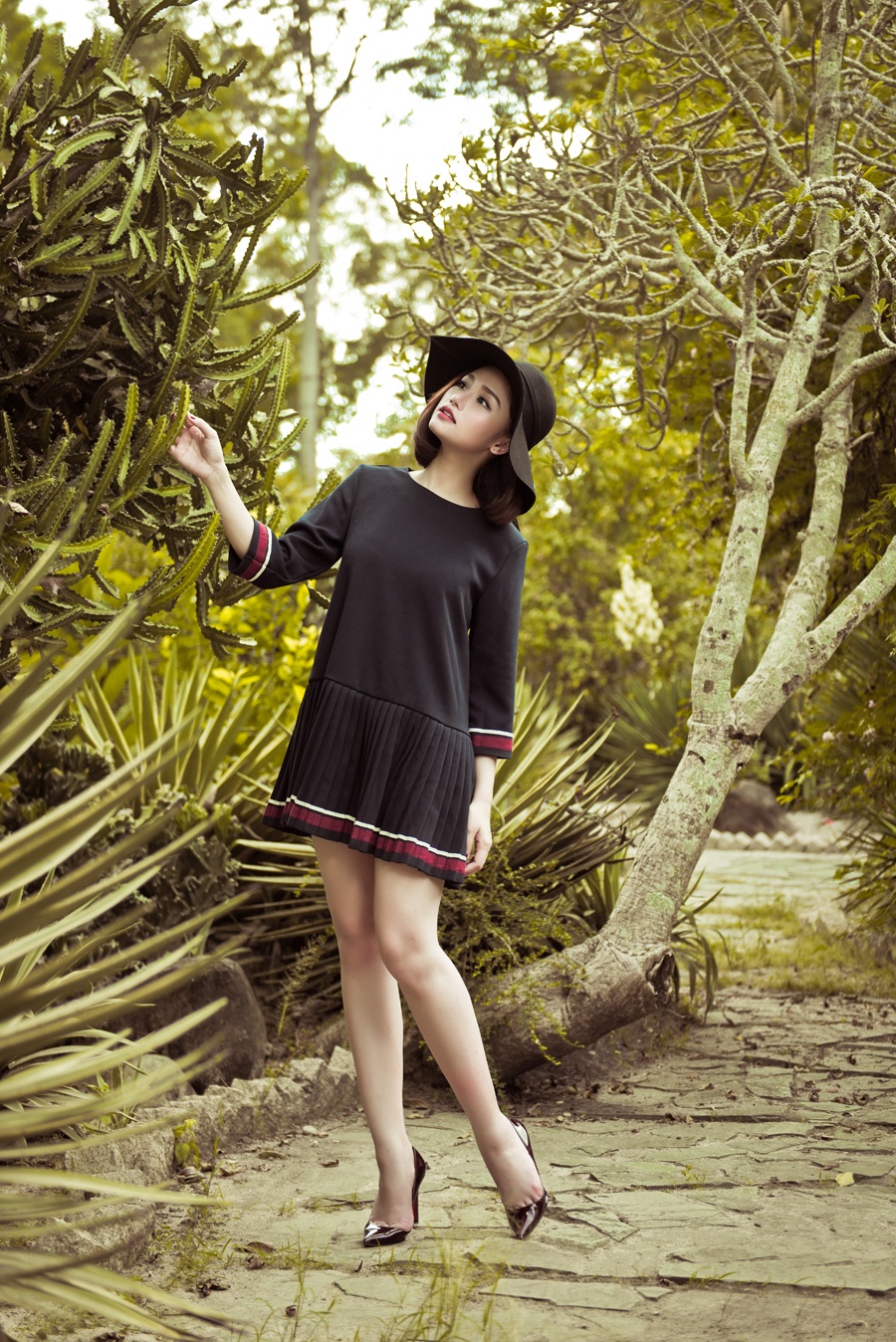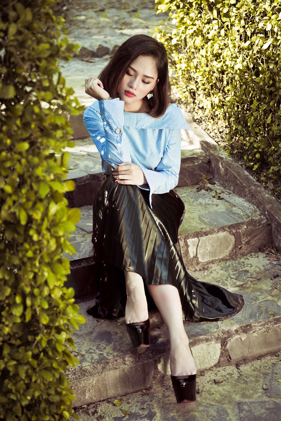 | Trong trang phục áo sọc kẻ xanh nhạt, chân váy chất liệu phi bóng xếp ly nữ tính, cô tạo dáng tự nhiên, yêu kiều. |