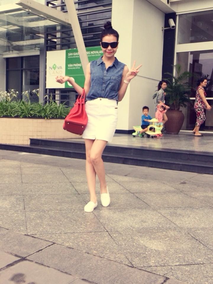 | Phong cách dạo phố đơn giản của Trà Ngọc Hằng với sơ mi denim và váy kaki. Bạn cũng có thể sử dụng mẫu áo này với váy xòe, váy bút chì, midi đều rất đẹp mắt. |