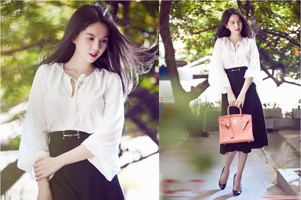| Thu Thủy với cách kết hợp váy loe và sơ mi trắng cổ điển. Bạn cũng có thể mix mẫu áo này với váy bút chì, maxi, midi đều rất ấn tượng. |
