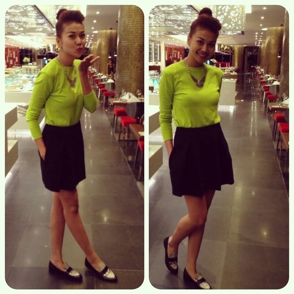 | Mẫu áo này có độ dài vừa phải nên rất dễ tính để mix kèm các loại váy. Một gợi ý của Minh Hằng với váy loe rất trẻ trung. |