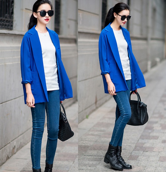 | Set đồ này rất đơn giản nhưng vô cùng hiệu quả với các bạn gái năng động. Skinny tối màu, áo phông đơn giản kết hợp cùng blazer dáng suông thoải mái. Điểm nhấn là đôi boot cổ ngắn cá tính và thoải mái. |