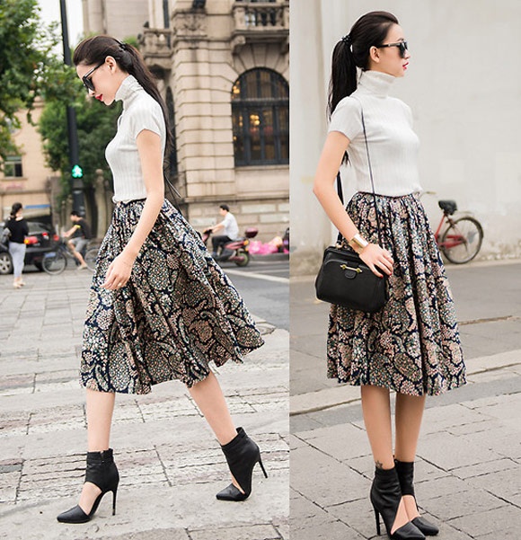 | Đây là phong cách thời trang đường phố mà các cô gái không thể chối từ. Kelly cực kỳ tinh tế khi chọn chân váy với sắc màu trầm khá tây cùng với áo cổ lọ cộc tay. Sự tuyệt vời còn thể hiện ở đôi boot với đường cut -out cá tính nhưng cũng vô cùng nữ tính. |