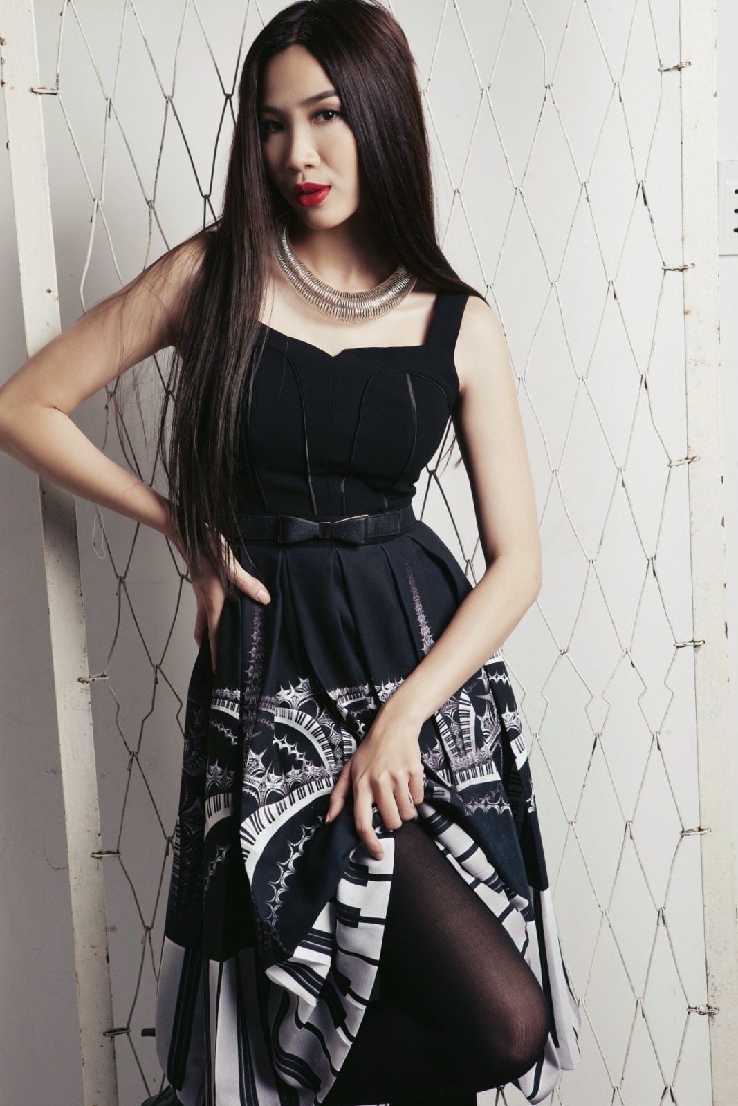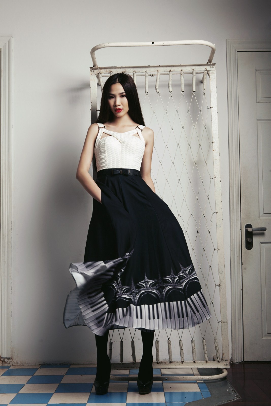 | Chiếc váy có họa tiết phím đàn piano được sắp đặt ngẫu hứng và sáng tạo. |