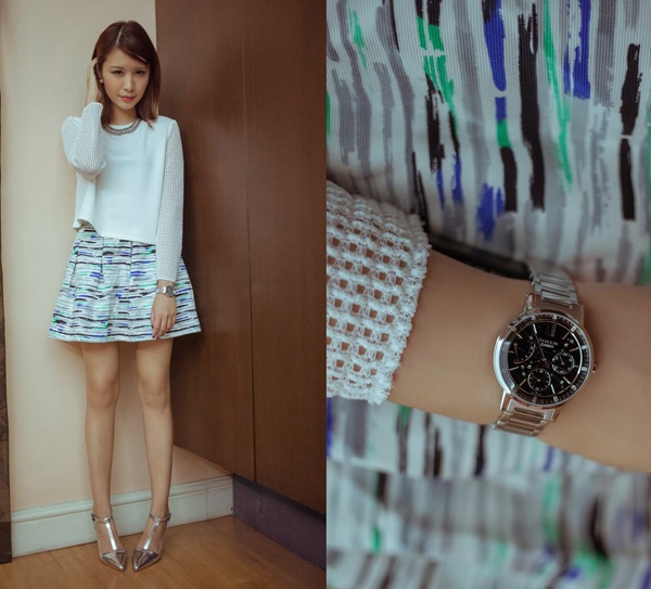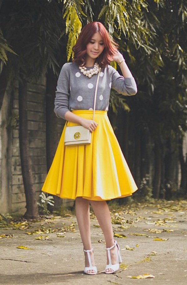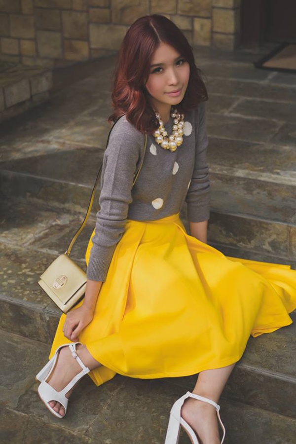 Phong cách "công chúa" cũng được Tricia áp dụng vào trang phục của mình bằng cách kết hợp sweater với váy xếp màu nổi bật. |