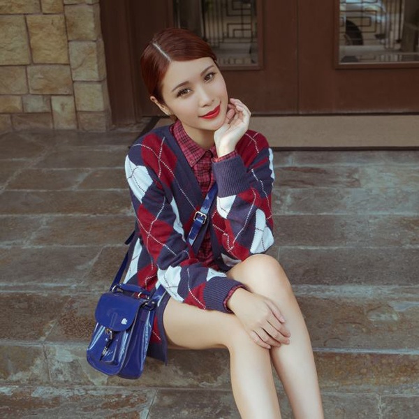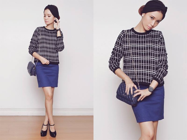 Cô nắm bắt rất nhanh xu hướng của thế giới khi kết hợp sơ mi, váy xòe ngắn cùng sweater họa tiết trẻ trung. |