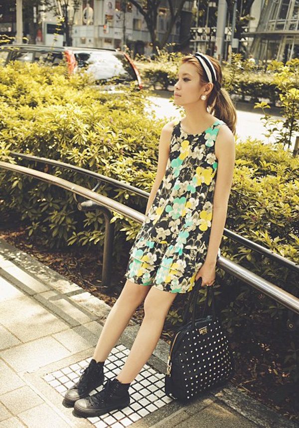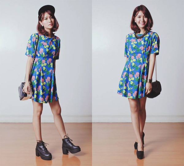 Hai phong cách trong một chiếc váy hoa. Nổi loạn khi kết hợp cùng ankle boots và snapback. Nhẹ nhàng khi đi cùng giày cao gót với điểm nhấn là vòng cổ. |