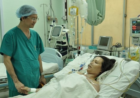 | Bệnh nhân đang được chăm sóc tích cực sau mổ bắt con và thay gốc động mạch chủ. Ảnh: Tùng Sơn. |