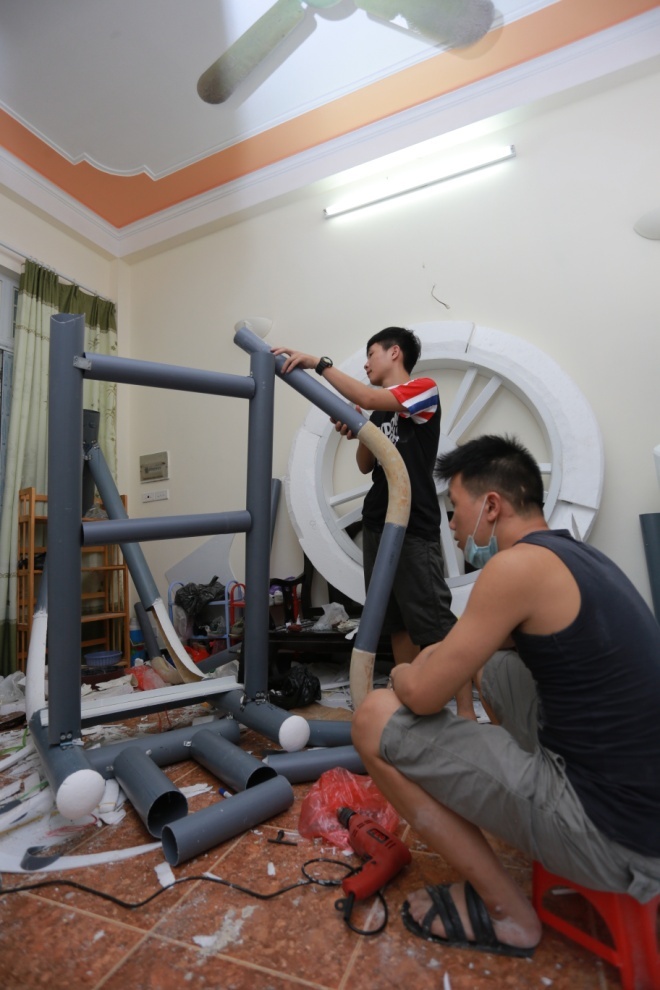 | Tân và nhóm bạn đang tính toán ghép các bộ phận trên xe sao cho khớp với thực tế. |
