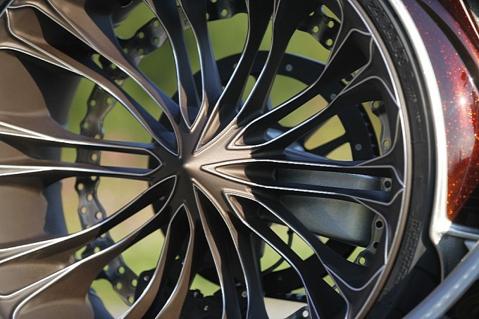 | Phuộc trước của xe được thiết kế với phong cách vừa cổ điển, vừa hiện đại nên có dáng vẻ bắt mắt. Thiết kế này kết hợp rất hài hòa với bộ vành trước kích thước 26 inch và được gắn đôi đĩa phanh đường kính 340 mm. Bộ vành xe được chế tạo với công nghệ CNC, tạo nên kiểu dáng rất đẹp. |