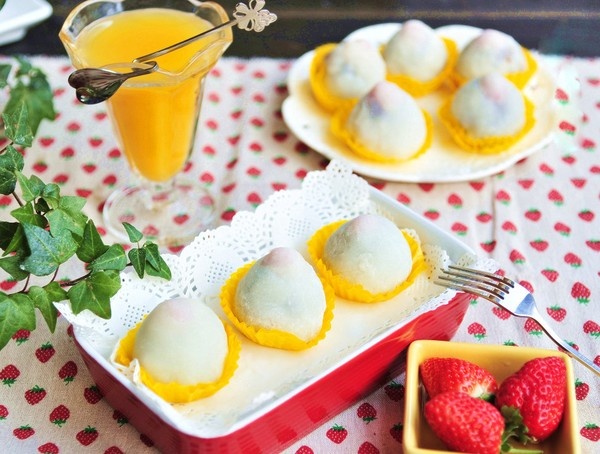 Bước 4: Bột bánh sau khi lấy ra khỏi nồi hấp ở trạng thái rất dẻo và dính, bạn có thể múc bột vào tô trộn khác đã có rải sẵn bột nếp rang. Nhồi bột lại lần nữa để bột đạt độ dẻo vừa phải. Chia khối bột này thành từng phần khoảng 35g, viên tròn lại rồi dùng thanh cán bột cán mỏng, đặt nhân đậu đỏ vào giữa vào bao kín lại, sau đó dùng tay làm tròn bánh lại là hoàn chỉnh. Nếu khéo gói vỏ bánh mỏng, bạn sẽ làm lộ được phần chóp nhọn màu đỏ của dâu tây ở đỉnh bánh rất đẹp mắt.
