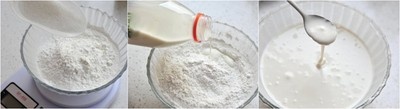 Bước 1: Trộn đều bột nếp, bột bắp và đường trắng vào trộn đều, thêm sữa vào, từ từ khuấy đều thành hỗn hợp lỏng, sánh. Khi đó mới thêm dầu bắp vào, khuấy lại lần nữa. Kiểm tra thấy hỗn hợp bột không bị vón cục là được rồi đấy