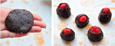 Bước 3: Ấn dẹt nhân đậu đỏ, đặt dâu tây vào giữa rồi bao lại nhưng không bao kín mà để lộ phần chóp nhọn ở phía trên. Phần nhân của bánh đã hoàn tất.