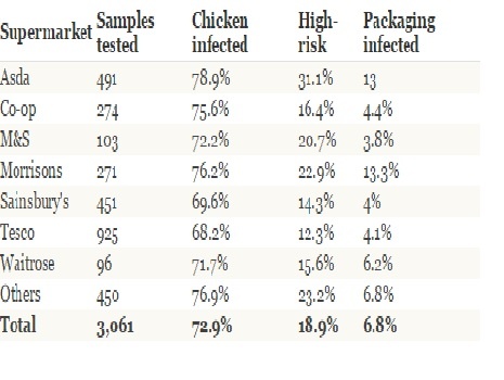 Tổ chức Tiêu chuẩn Thực phẩm (FSA), đơn vị có trách nhiệm và tiếng nói trong việc bảo vệ người dân khỏi ngộ độc thức ăn, cũng đưa ra chỉ trích nặng nề nhắm vào các siêu thị vì đã không thực hiện nghiêm túc quy trình tiệt trùng và làm sạch thịt gà.Trong một báo cáo mới nhất của Văn phòng Thống kê quốc gia Anh, các nhà chức trách đã đưa ra kết luận rằng tất cả thịt gà, bất kể chúng được bày bán ở siêu thị hay cửa hàng bán lẻ nào đi chăng nữa, đều có khả năng gây ngộ độc thực phẩm.