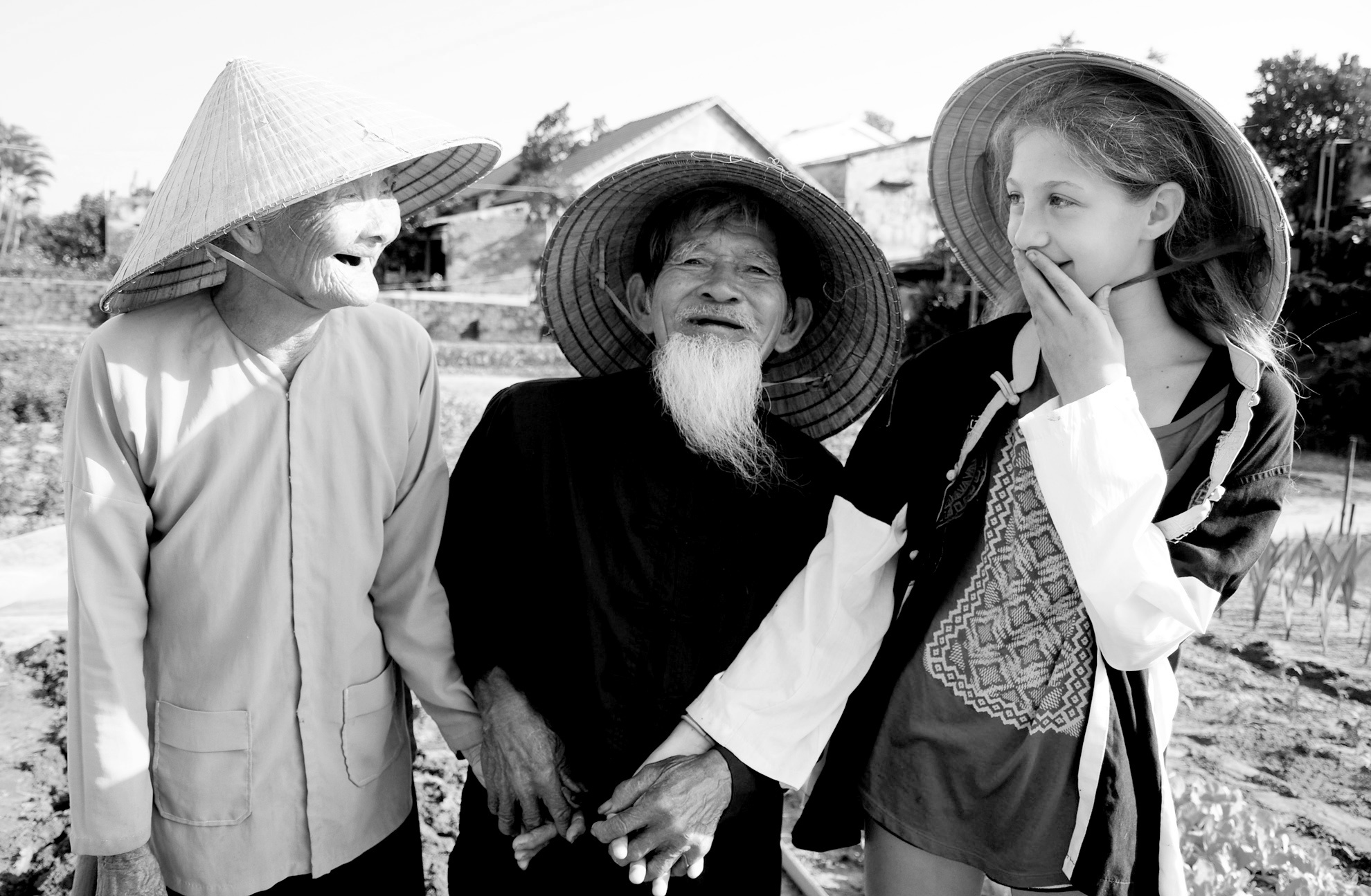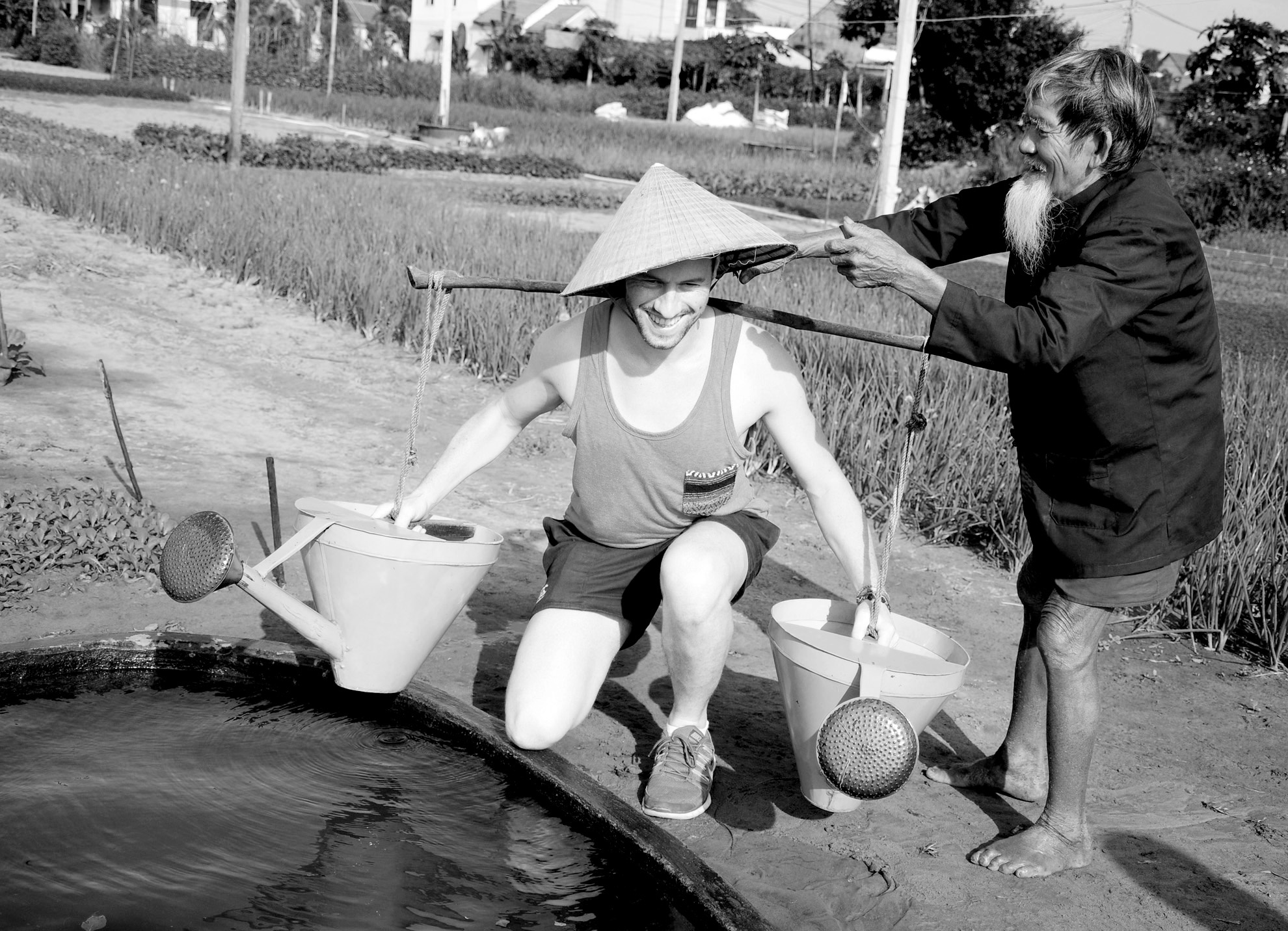 Một lần gặp du khách nước ngoài, cụ Sỏ hướng dẫn cho du khách đội nón, quẩy gánh múc nước tưới rau. "Mình sống tình cảm, thân thiện, gần gũi thì khách nước ngoài họ mới đến. Ngày nào vợ chồng tôi cũng đón từ 7 đến 10 đoàn du khách đến thăm vườn nên thấy lòng vui lắm", cụ bộc bạch. |