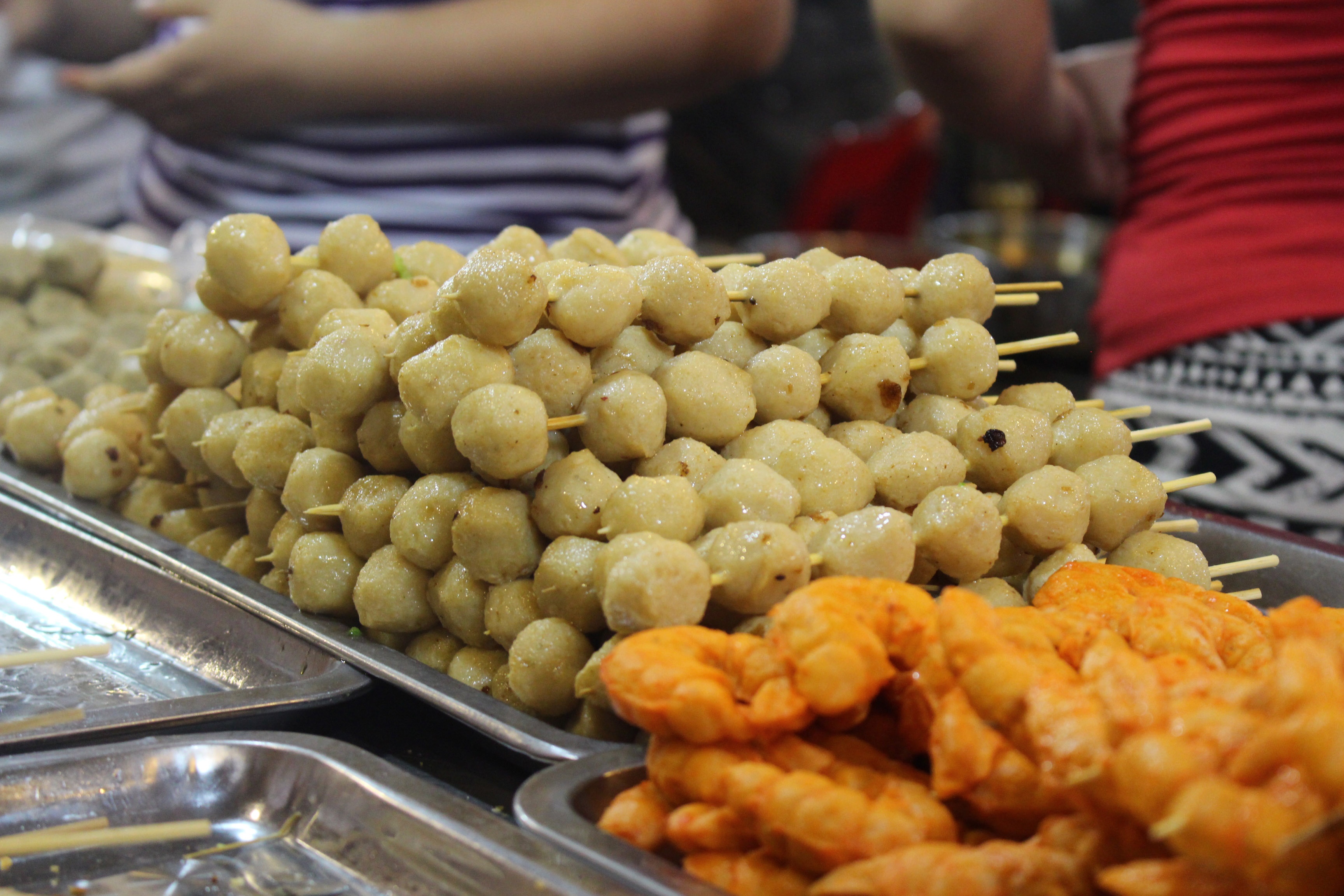 Cá viên chiên, bò viên hay tôm viên đều hút thực khách với vị ngon của món chiên nóng hổi, thơm lừng chấm kèm hai loại tương đậm đà. Giá mỗi xiên từ 5.000-7.000 đồng.