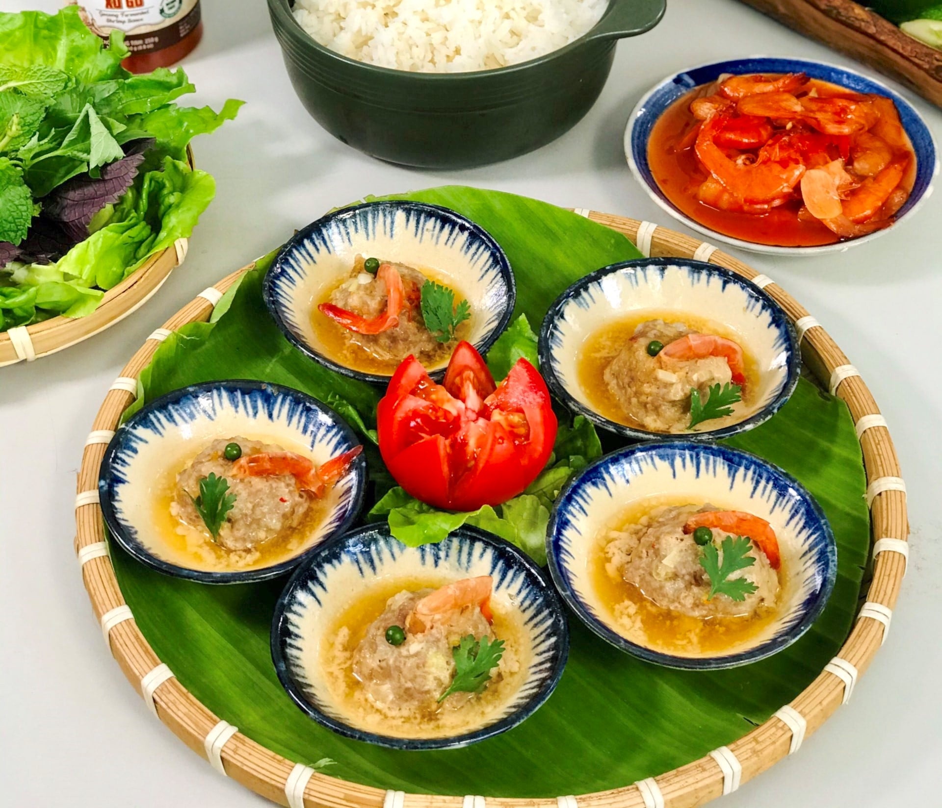 - Món chả viên tôm chua có thể ăn kèm với cơm nóng, bún hay bánh mì, thêm một ít rau thơm.