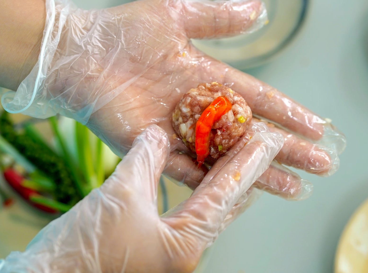 - Vo viên thịt, rồi đặt một con tôm chua lên.