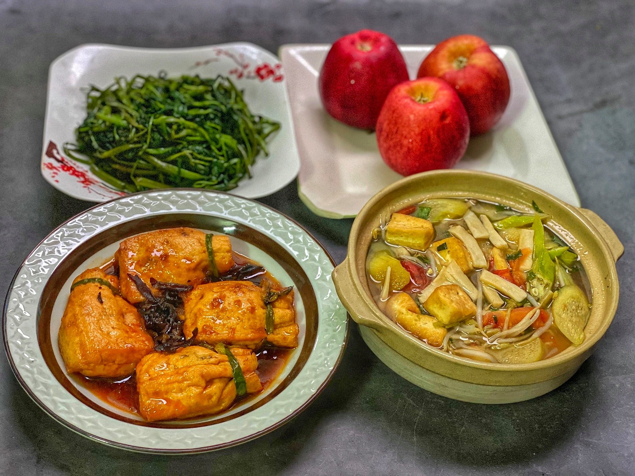 | Chia sẻ với Zing, Thanh Thoa cho biết mình học theo các công thức nấu món chay trên các diễn đàn, hội nhóm và biến tấu lại theo sở thích cá nhân. Để đảm bảo món chay đầy đủ dinh dưỡng, an toàn cho sức khỏe, người nội trợ cũng cần chú trọng việc lựa chọn nguyên liệu tươi và sạch. Cho sả băm lên đậu đậu hũ rồi đem chiên vàng hai mặt là có thể thưởng thức với canh chua chay, đậu bắp luộc chấm chao, dưa hấu tươi mát. |