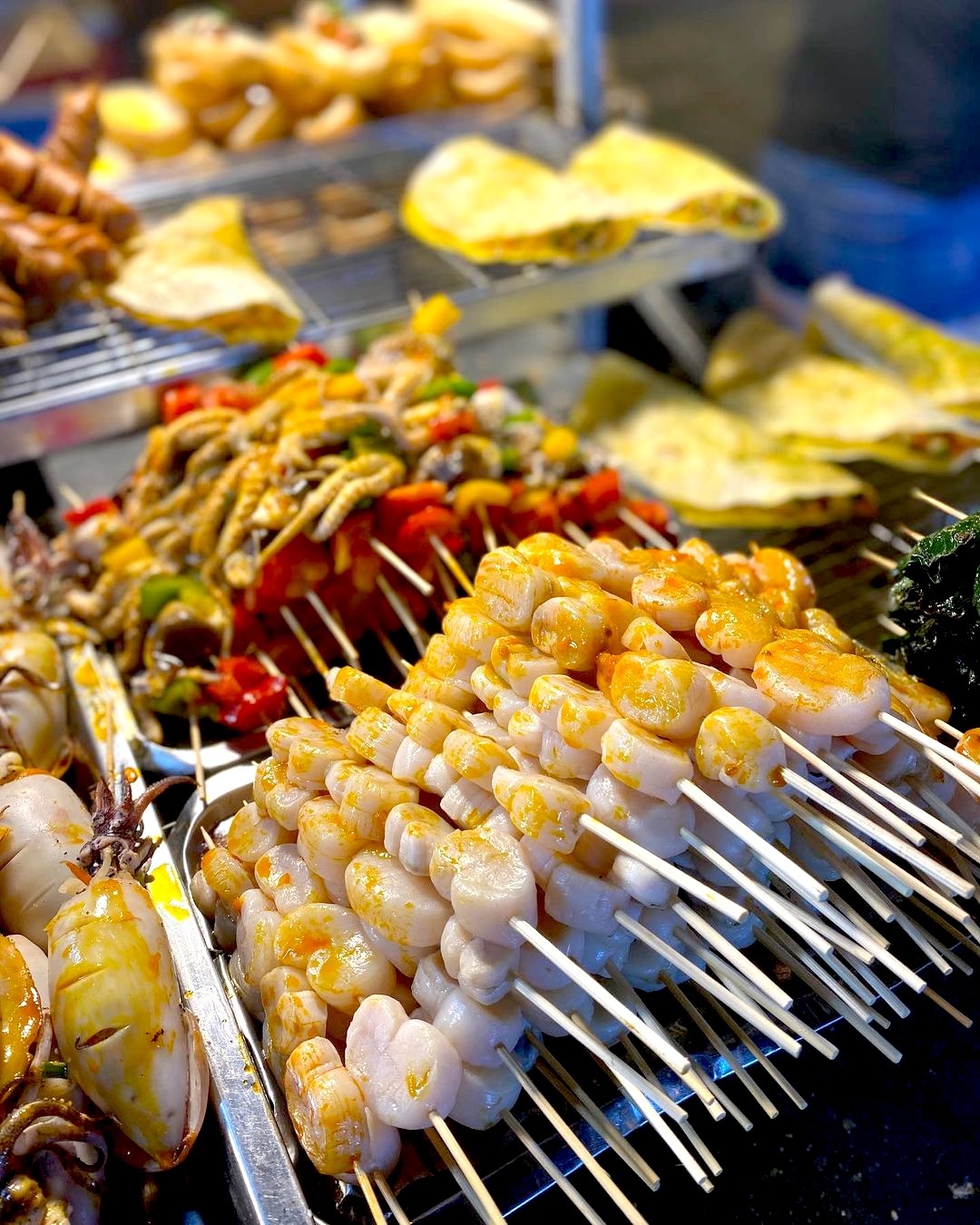 Tại chợ đêm Phú Quốc có một số món ăn thường được đựng trong chén nhỏ, trình bày bắt mắt, như trứng cút nướng, hàu sữa nướng phô mai, hàu sữa nướng bơ, sò điệp nướng bơ, sò điệp nướng mỡ hành, bạch tuộc tẩm ướp... Ảnh: Pumpkin_da_great. |