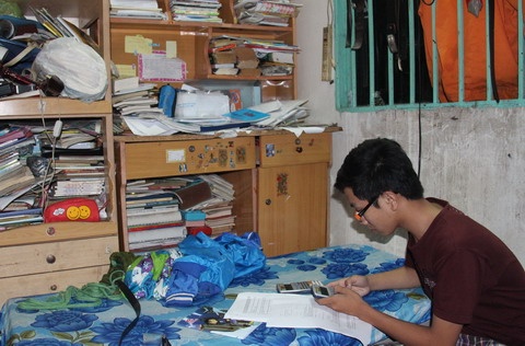 Tôi đến góc học tập của Thiện trên căn gác nhỏ. Phòng chật hẹp không đủ kê chiếc bàn viết. Tấm đệm vừa để ngủ vừa làm bàn học đã nhiều đêm Thiện lăn lộn với những con số.