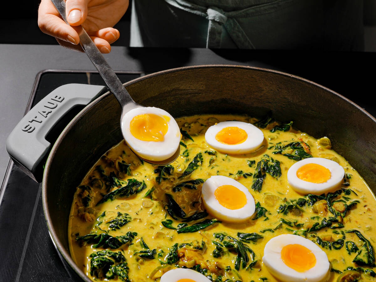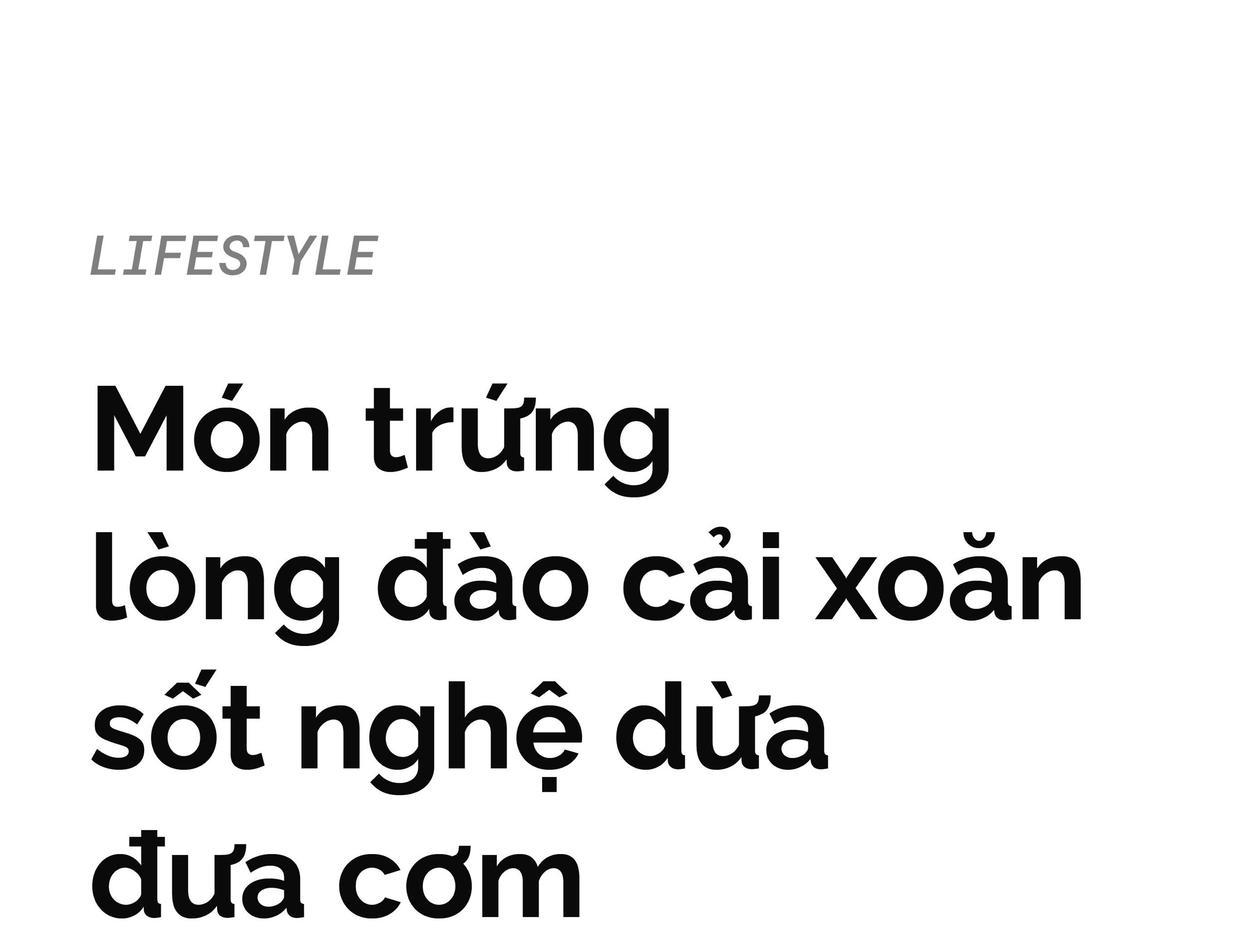 - Thưởng thức trứng lòng đào cải xoăn sốt nghệ dừa với cơm nóng.