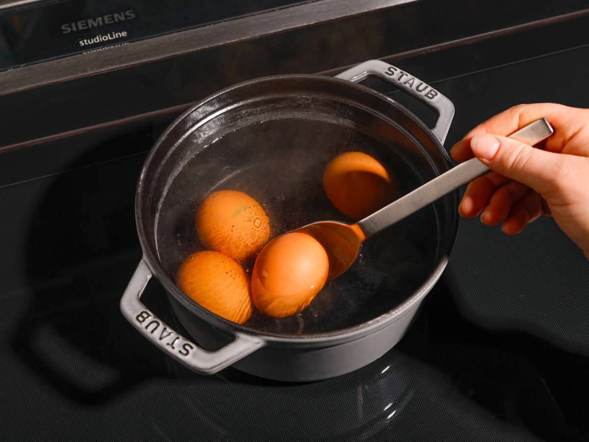 - Đun sôi một nồi nước, dùng thìa nhẹ nhàng hạ thấp trứng vào và luộc chín trong 6 phút 30 giây.