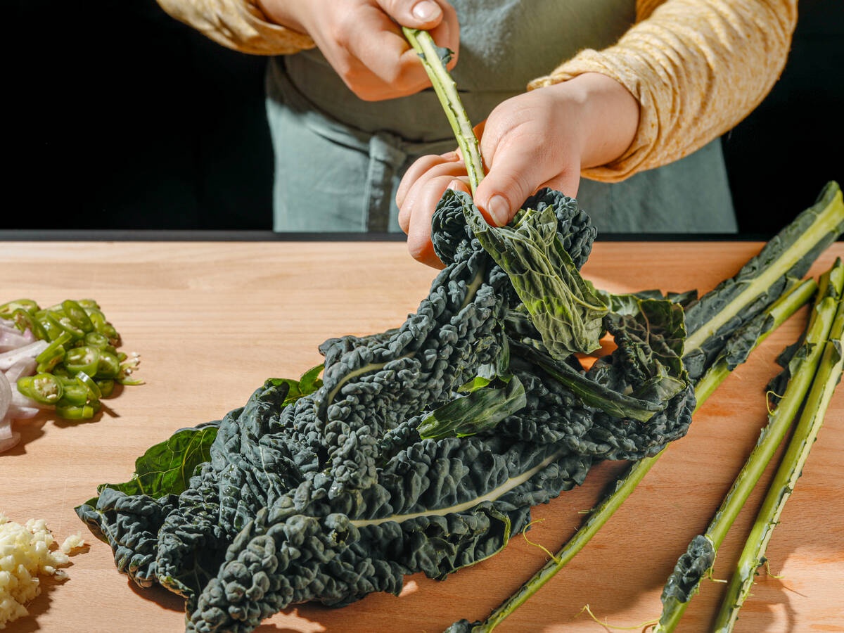 - Loại bỏ phần lá cải xoăn ra khỏi thân. Cắt hoặc xé lá thành từng khúc khoảng 4 cm.