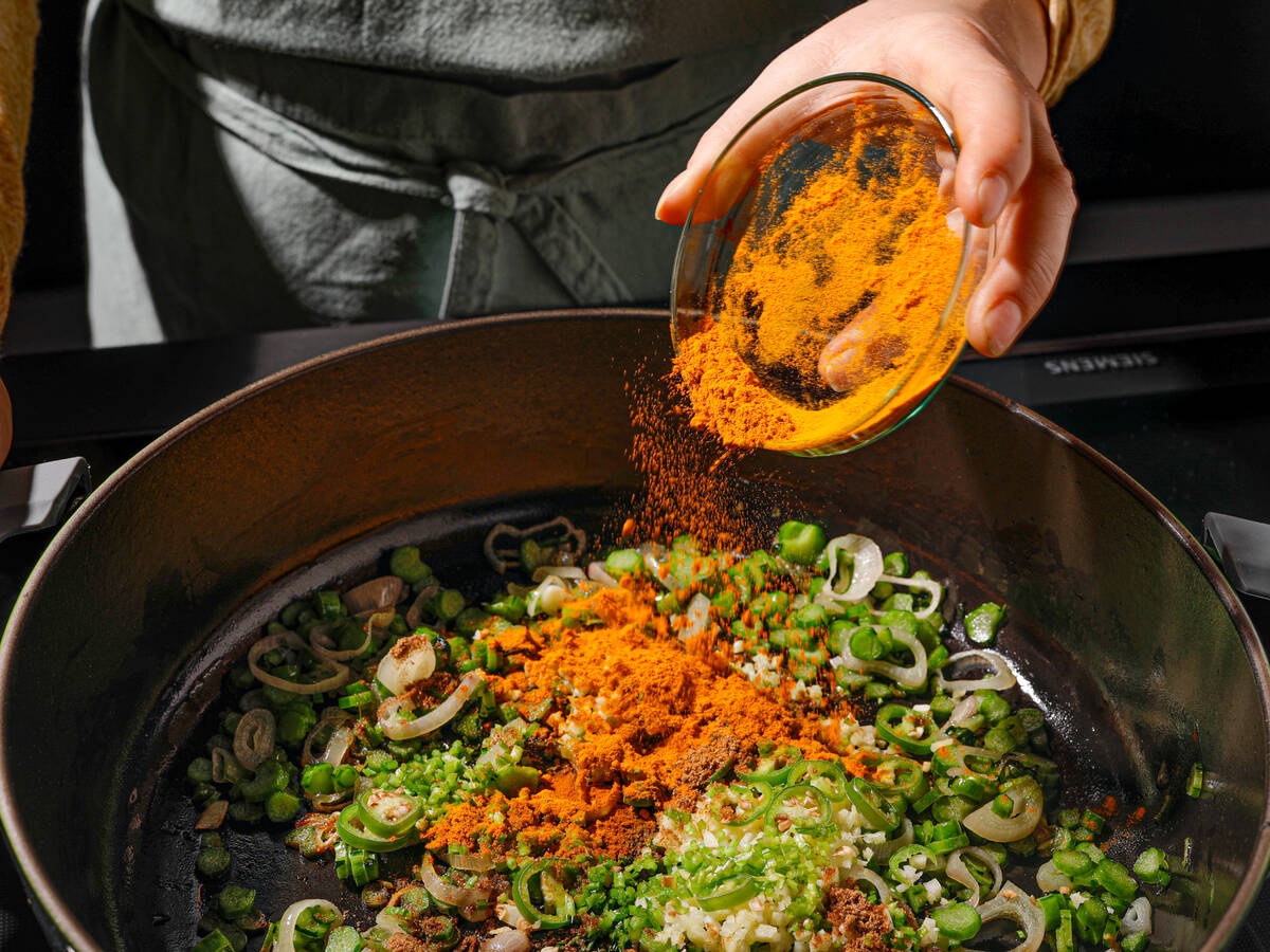 - Thêm gừng, tỏi, một nửa ớt thái lát, rau mùi tàu và nghệ vào chảo, tiếp tục xào khoảng 2 phút đến khi thơm.
