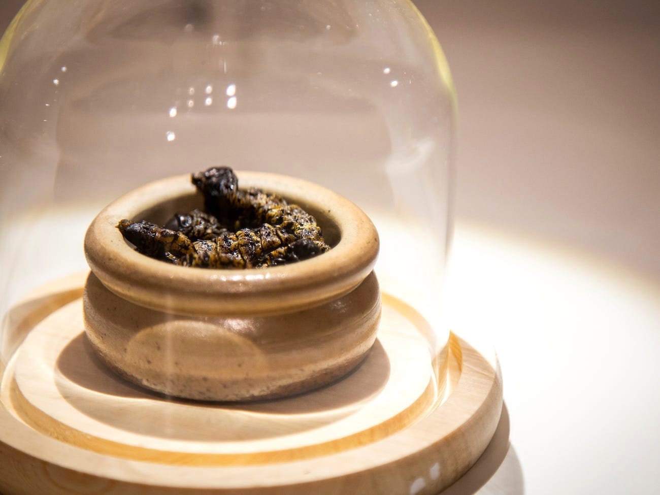 Bảo tàng thức ăn kinh dị ở Malmo (Thụy Điển) trưng bày khoảng 80 món ăn từ 35 quốc gia, thách thức người xem không chỉ về vị giác mà còn cả về tâm lý. Bảo tàng rộng 400 m2 với 2 khu vực chính là khu triển lãm và khu vực nếm thử. Một số món có thể khiến nhiều khách rợn người là sinh tố ếch (Peru), thịt cá mập lên men (Iceland), phô mai giòi Sardinia (Italy), nhãn cầu cừu ngâm nước ép cà chua (Mông Cổ)... Trong ảnh là sâu bướm Mopane chiên, món ăn đặc trưng và không kém phần kỳ dị ở Zimbabwe. Ảnh: Anja Barte Telin. |