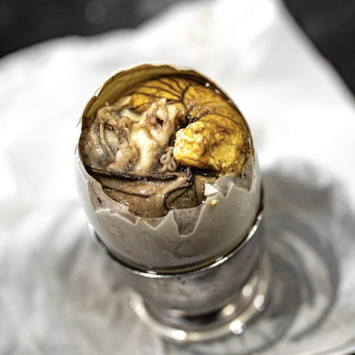 Trứng vịt lộn là món ăn đường phố phổ biến ở Việt Nam và Philippines. Người Philippines thường ăn trứng vịt lộn kèm muối trắng hoặc giấm. Trong khi, thực khách Việt quen với cách thưởng thức cùng rau răm, muối tiêu chanh. Ngoài ra, vịt lộn xào me hay kết hợp trong cháo, bún, lẩu cũng là những gợi ý đáng thử. Trứng vịt lộn thơm ngon, bổ dưỡng, song có lẽ bởi món ăn được chế biến từ bào thai vịt con khiến nhiều người (đặc biệt là thực khách phương Tây) khó chấp nhận nếm thử. Ảnh: Spooningaust. |