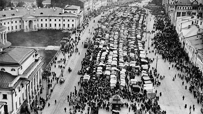 Moscow đã thay đổi rất nhiều trong 100 năm qua. Chợ Sukharevsky tại Moscow (chụp năm 1920) đã biến mất, nhường chỗ cho đường cao tốc rộng thênh thang, 16 làn xe. Ảnh: TASS/ Barcroft Media