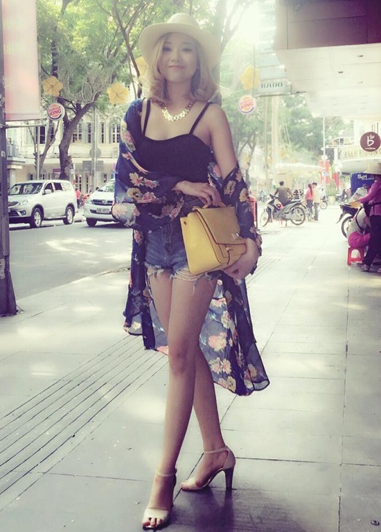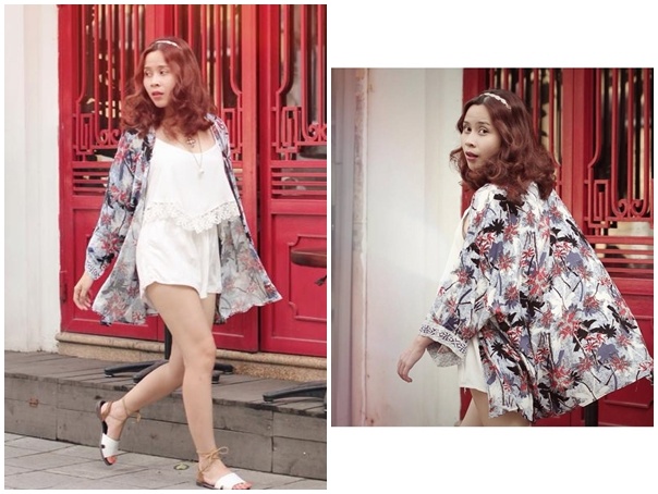 Khi xuống phố Sài thành những ngày đầu hè nắng nóng, Tóc Tiên diện áo khoác kimono nhiều màu sắc tươi mát. Kiểu áo truyền thống Nhật Bản được cách tân về đường nét, họa tiết và màu sắc phù hợp với xu thế hiện đại.