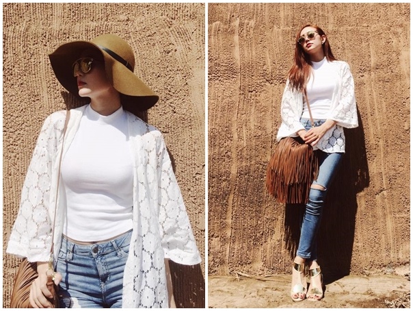 Á quân Bước nhảy hoàn vũ - Angela Phương Trinh đón đầu mốt cardigan ren dáng dài. Thiết kế mix đồng điệu cùng quần jeans, mũ, giày đồng gam trắng. Một ngày khác, nữ diễn viên chọn áo khoác chất voan mỏng, được in họa tiết bắt mắt.