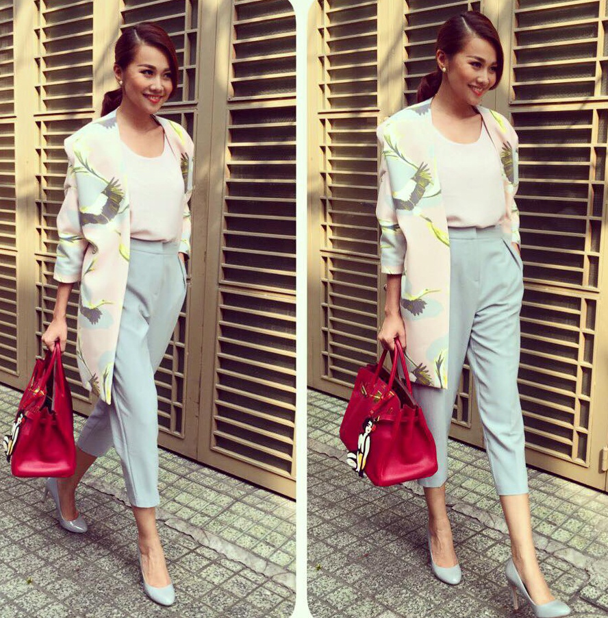 Thanh Hằng cho thấy hình ảnh nữ tính, điệu đà khi chọn áo khoác họa tiết hoa màu pastel. Đi kèm là set đồ thanh lịch gam màu nhạt hợp tổng thể.