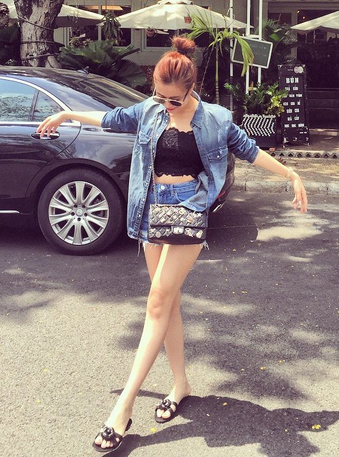 Phong cách áo khoác denim cá tính cũng được chân dài ưa chuộng, ứng dụng hiệu quả với áo thun khoe eo và quần ngắn để lộ đôi chân thon dài.