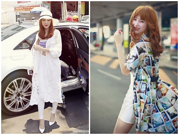 Mốt áo khoác mỏng nhẹ, in họa tiết hoa tươi mát của Hồ Ngọc Hà được người hâm mộ yêu thích. Kiểu dáng mỏng thoáng mát được cho là phù hợp với tiết trời oi bức mùa hè phương Nam.