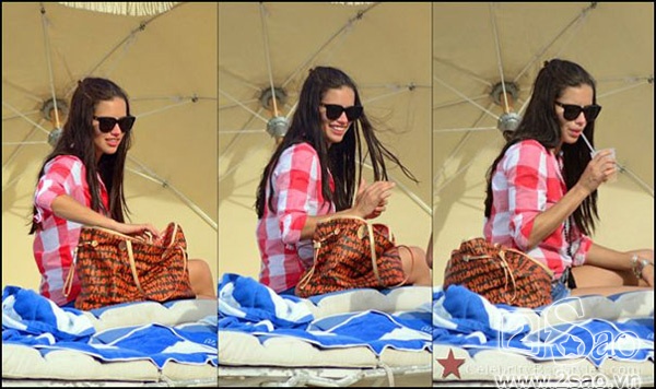 | Chiếc túi to bản họa tiết chất liệu mềm hiệu Louis Vuitton cũng được siêu mẫu Adriana Lima chọn để đựng đồ đi biển. |