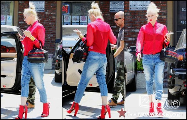 | Gwen Stefani rực rỡ nhờ chiếc áo đỏ, giày đỏ và chiếc túi có họa tiết đỏ hiệu Christian Louboutin. |