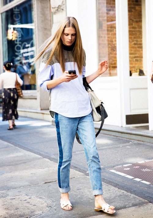 | Sự pha trộn nhiều màu sắc denim trên một trang phục giúp những bộ trang phục denim bớt cứng nhắc hơn. |