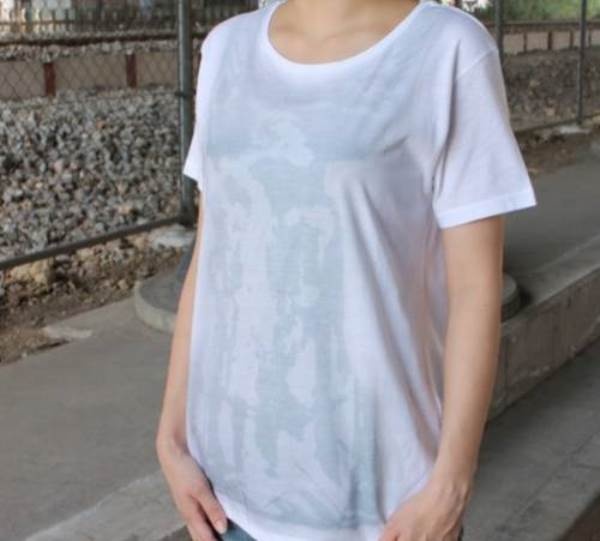 | Cô gái này trông như đang mặc một bộ đồ bơi còn ướt bên trong. |