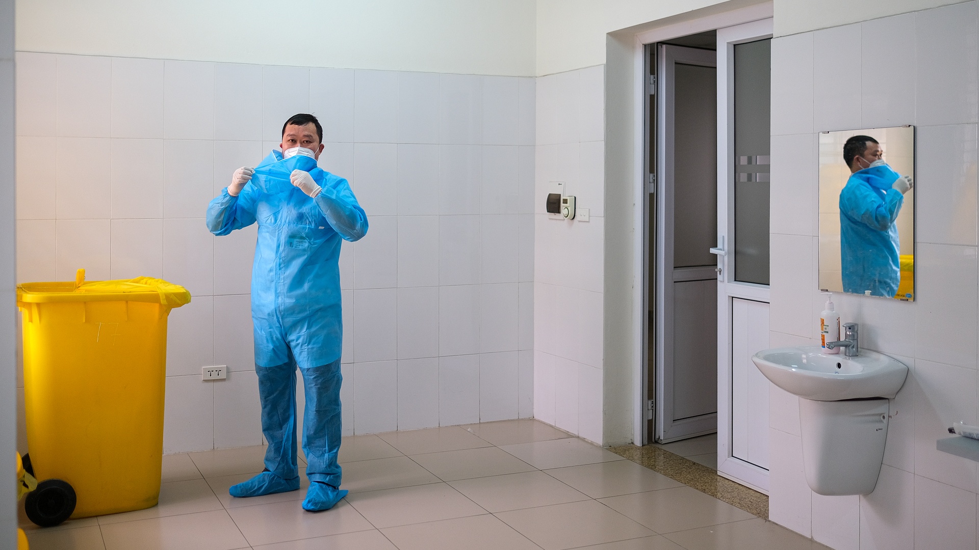 | 57 ngày không có ca nhiễm trong nước vừa qua giúp công việc của chúng tôi bớt áp lực. Giờ đây, cuộc chiến mới lại bắt đầu với lịch làm việc dày đặc. Kết thúc cuộc họp, tôi khẩn trương mặc đồ bảo hộ để thăm khám cho bệnh nhân. |