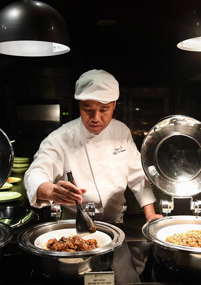| Hỗ trợ công việc quản lý bếp của tôi còn có một tổng bếp trưởng của khách sạn và nhiều đầu bếp khác. Chúng tôi liên tục trao đổi với nhau trong ca để điều chỉnh số lượng món, bổ sung thức ăn trong buổi buffet. Guồng làm việc căng thẳng nhất trong bếp là từ 16-18h. |