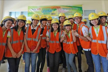 | Trang bị đầy đủ áo và nón bảo hộ, các “đại sứ môi trường” của CLB Chung ước mơ xanh trông không khác gì một kỹ sư thực thụ. |