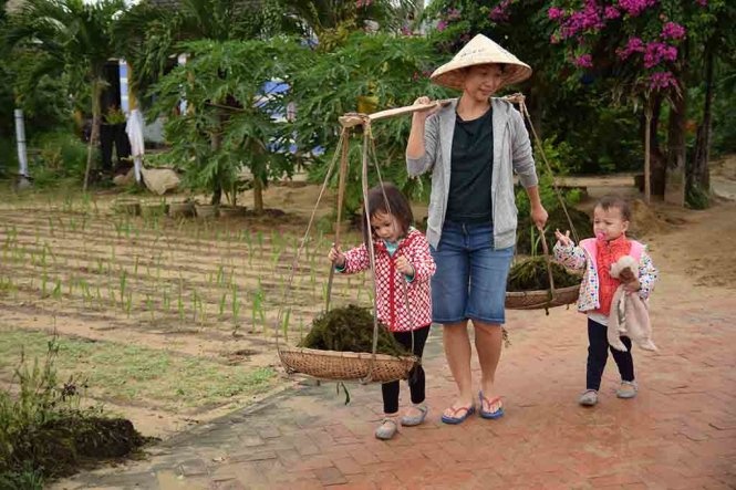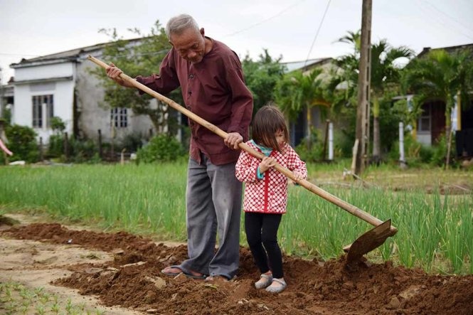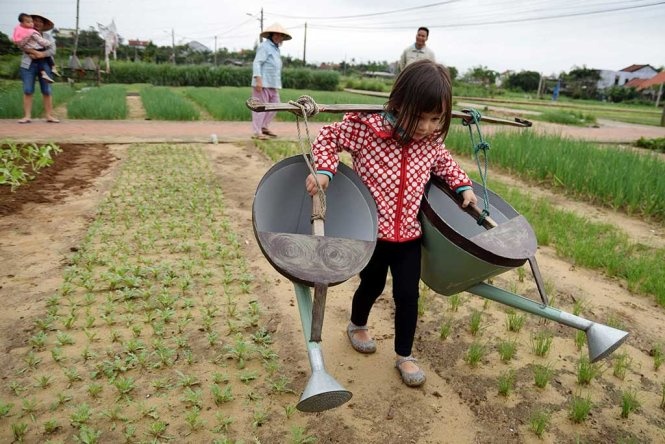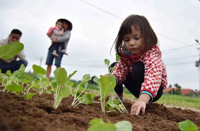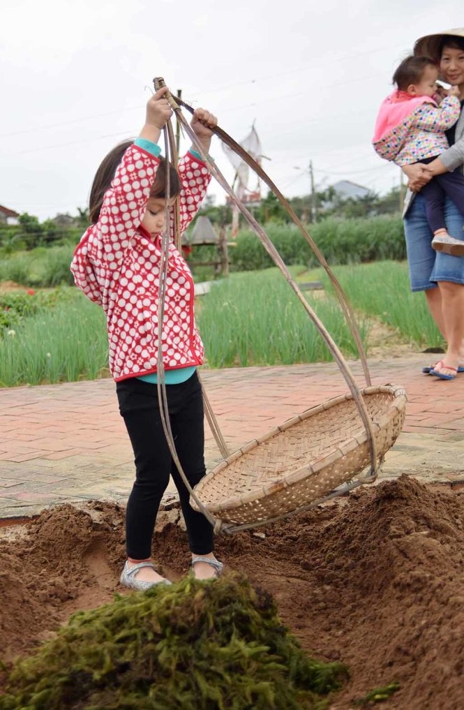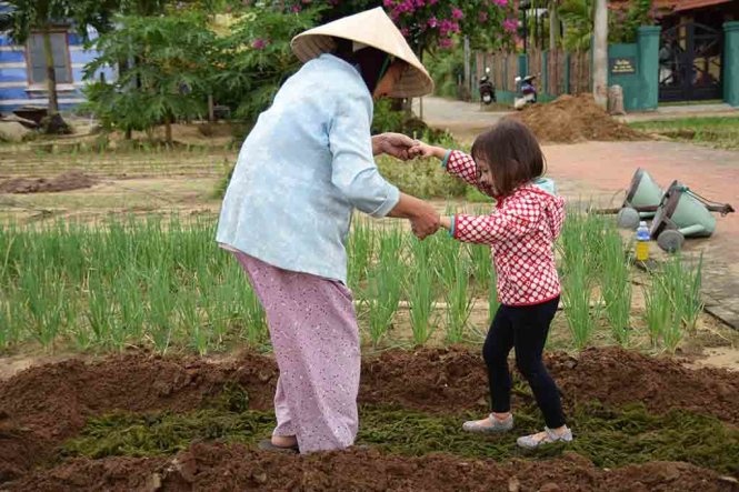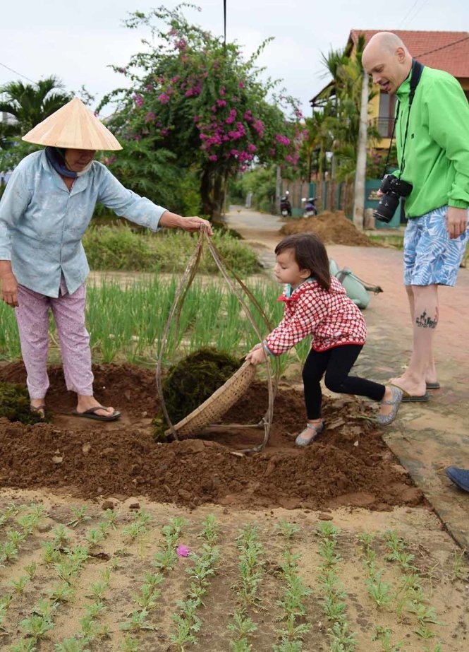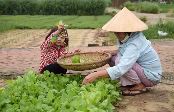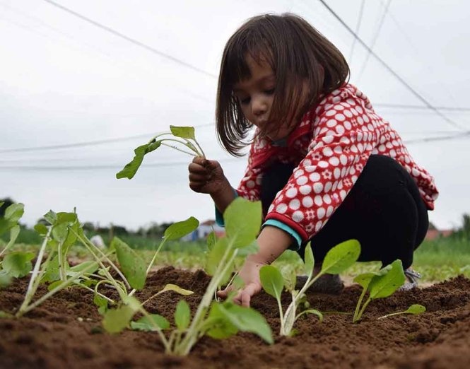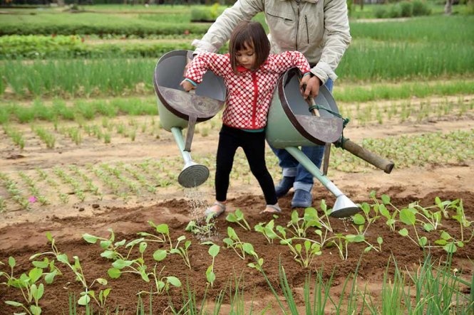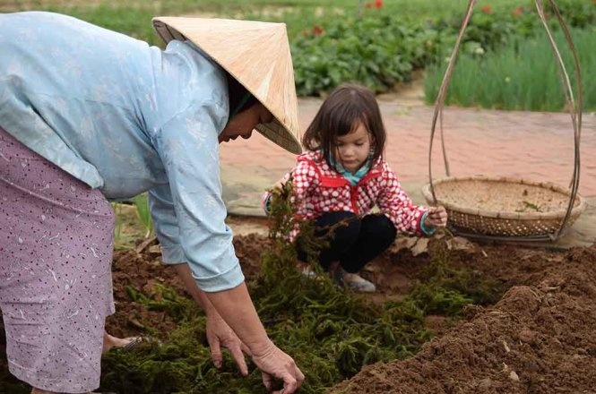 Trong khi ông bố say sưa ghi lại những khoảnh khắc con gái hăng say lao động, "học mà chơi, chơi mà học" trên vườn rau truyền thống ở Việt Nam. |
