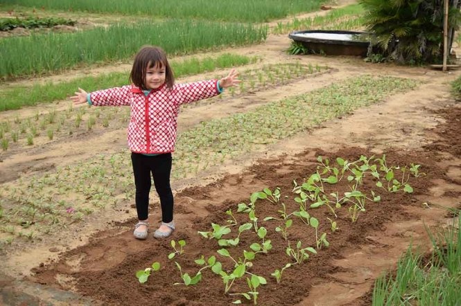 Tạo dáng bên luống rau mới trồng để bố chụp ảnh. |