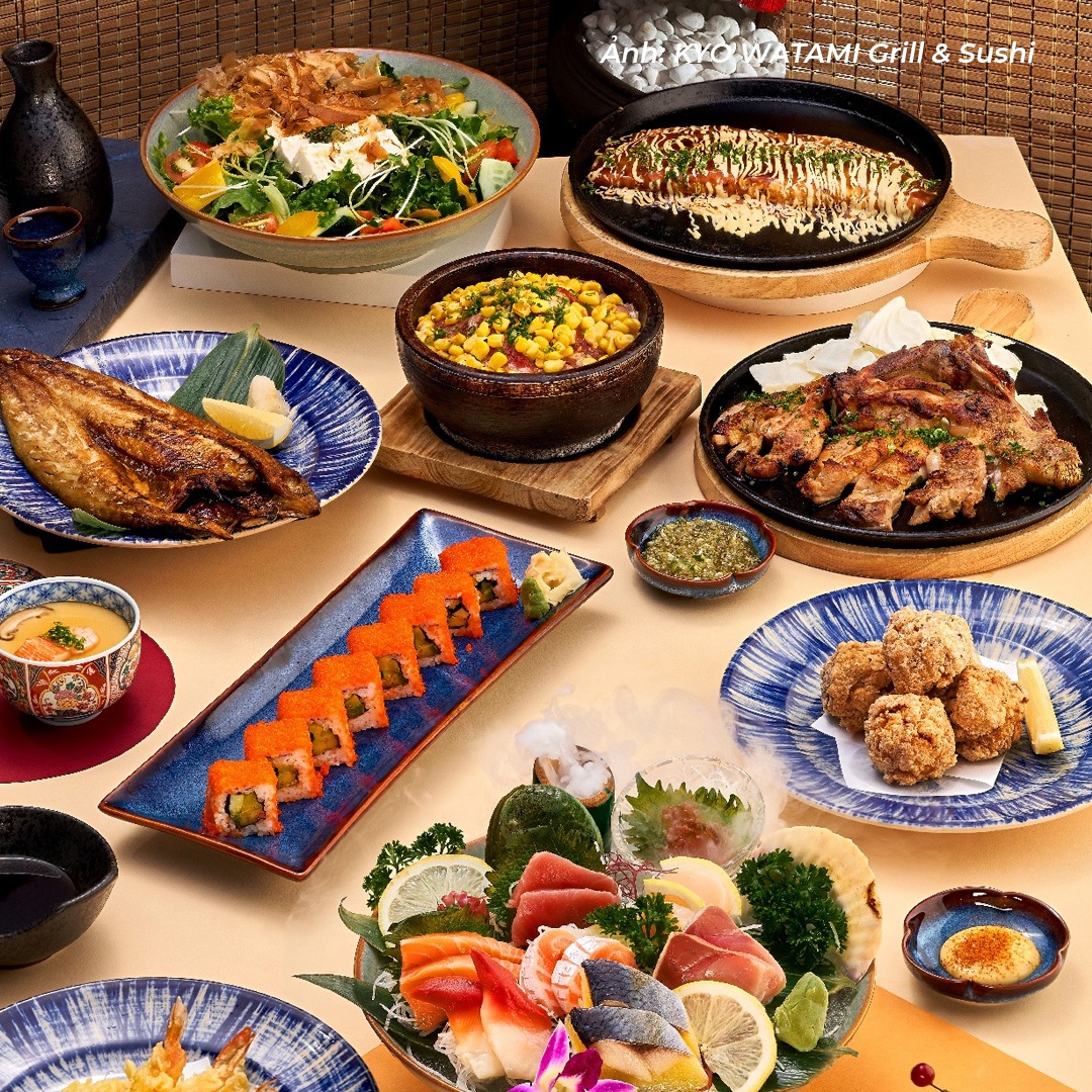 Món gợi ý: Wagyu sushi, gà nướng Torimomo Aburiyaki, salad Kyo Watami, lẩu Watami Sukiyaki...