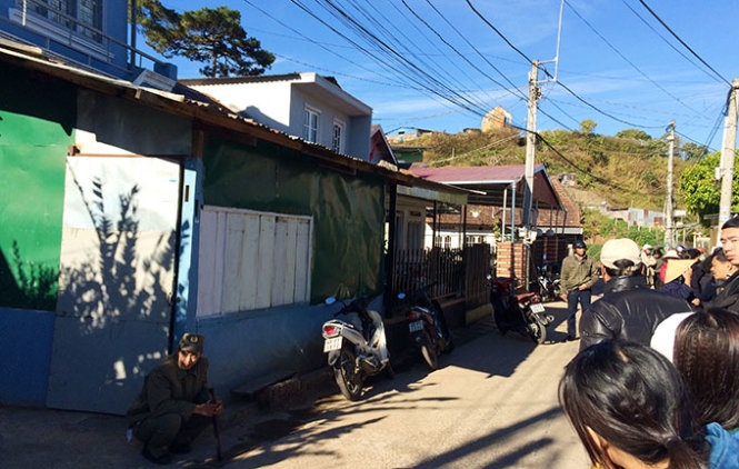 | Người dân hiếu kỳ vây quanh nhà nạn nhân sáng 14/1. |
